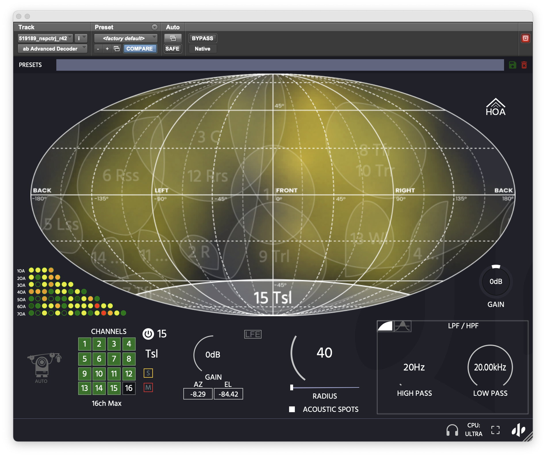 ‘ab Advanced Decoder’ adapts to your Ambisonics signal automatically, meaning that you can feed any Ambisonics signal from 1st through 7th order (1OA through 7OA*) without the need to set anything up!