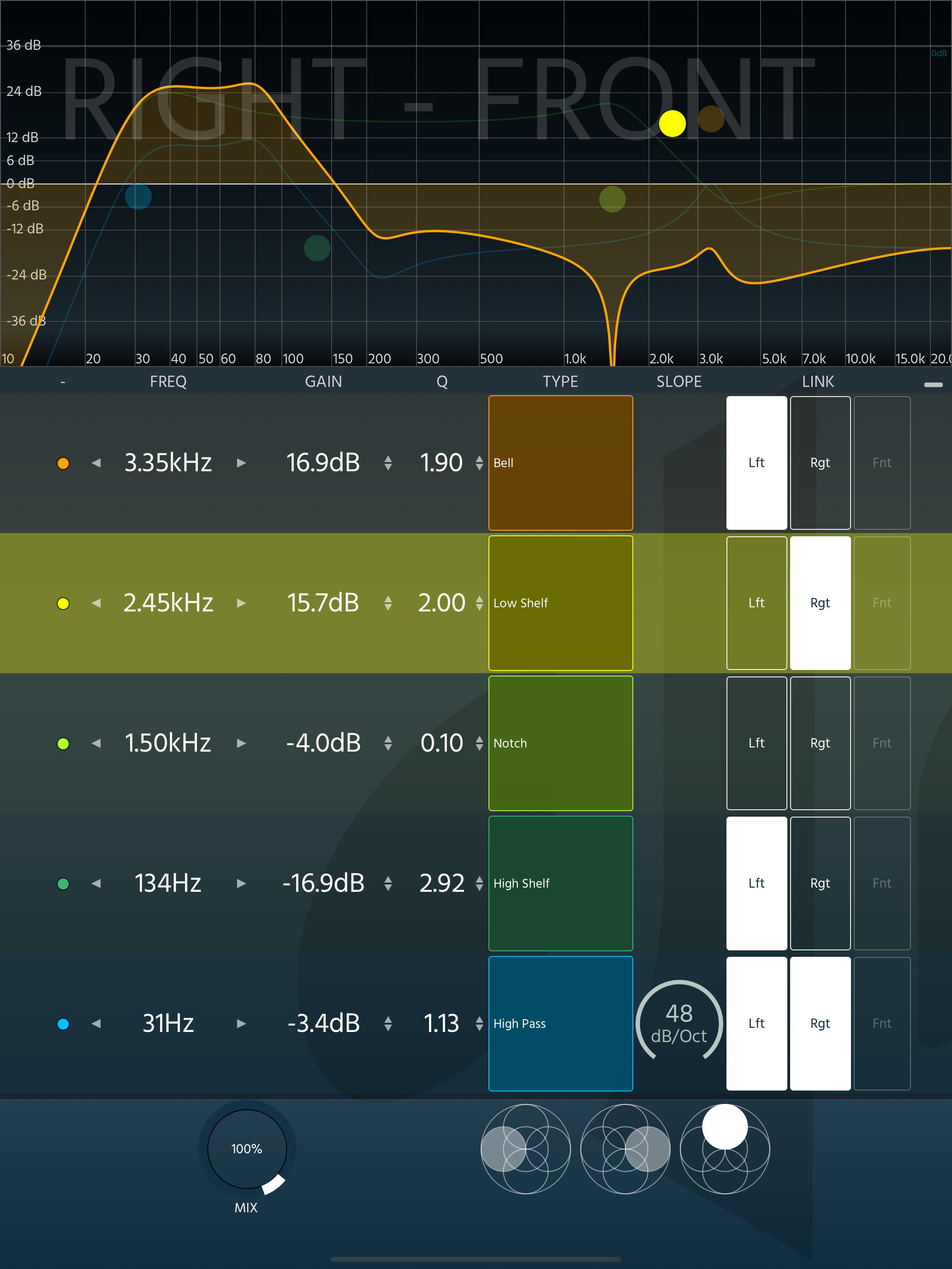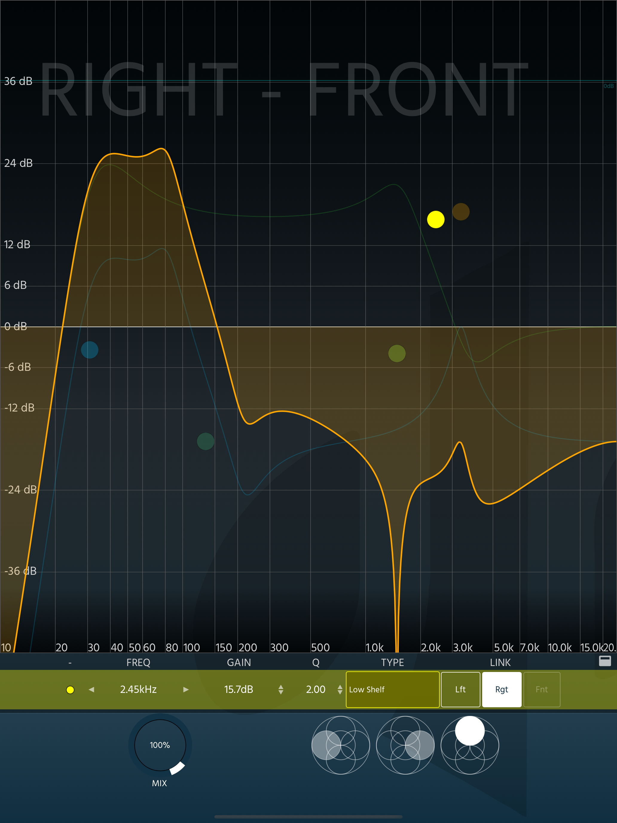 GAIN: Control the gain of a band, from -36dB to +36dB. You can either write down a number, or drag vertically to adjust.